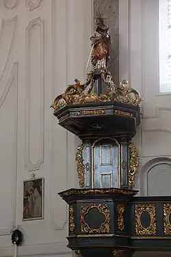 Da die früheren Jahrhunderte die Konzelebration nicht kannten, wurden in der Kirche mehrere Altäre benötigt, auf denen zur gleichen Zeit sogenannte Beimessen gefeiert werden konnten. Deshalb stehen in der Kirche auch vier Seitenaltäre. Die beiden Altäre am Chorbogen, jeweils zwischen grauen Marmorpilastern eingepasst, sind ähnlich aufgebaut wie der Hochaltar, jedoch wesentlich einfacher ausgestattet. Sie tragen lediglich zweisäulige Aufbauten mit seitlichen goldenen Akanthusranken. Der linke Seitenaltar zeigt im Altarblatt den hl. Antonis von Padua, der von Maria einen Rosenkranz erhält. Davor steht eine neuere Madonnenfigur. Der Auszug enthält ein Reliefbild des hl. Georg, flankiert von Puttenfiguren. Sie tragen einen Spiegel (Klugheit) und einen Krug (Mäßigkeit). Zusammen mit der Engelsgruppe rechts versinnbildlichen sie die vier Kardinaltugenden. Im Altarblatt des rechten Seitenaltars ist der hl. Franz Xaver dargestellt (um 1841 von J. A. Engelhardt). Den Auszug schmückt ein Halbrelief des hl. Josef, die danebenstehenden kleinen Putti tragen eine Waage (Gerechtigkeit) und eine Palme (Tapferkeit). Die oberen Teile beider Altäre mussten bei der Neuaufstellung ausgewechselt werden, die Schnitzereien führte Bildhauer Scheel aus.