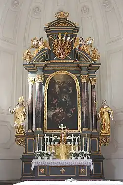 Beinahe zwangsläufig geht der Blick zum Hochaltar. Zu ihm führen mehrere Stufen hinauf und unterstreichen seine Bedeutung als Mittelpunkt des kirchlichen Lebens. Der Altar stammt aus der Erbauungszeit der Barockkirche. Er ist in Blautönen gefasst und mit goldenen Einzelornamenten versehen. Der Entwurf des Altares stammt von dem Eichstätter Hofbaumeister Jakob Engel, ausführender Tischler war Hans Jakob Bockler; die Schnitzereien fertigte die Eichstätter Bildhauerfamilie Handschuher. Auf wuchtigem Unterbau erheben sich zwei rot marmorierte Säulenpaare mit goldenen korinthischen Kapitelle, die breite Gesimse tragen. Darauf stehen auf gebrochenen Rundbögen zwei große Engelsgestalten, die sich dem vasengeschmückten Altarauszug zuwenden. Dort hat sich der Stifter des Altars mit seinem Wappen verewigt. Einen weiteren Hinweis geben die lateinischen Inschriften auf den Tafeln der Engel. Diese lauten übersetzt: „Johann Euchar, durch Gottes Gnade Bischof von Eichstätt, des Heiligen Römischen Reichs Fürst 1695“. Das unsignierte Altarbild stammt wahrscheinlich von dem fürstbischöflichen und später kurfürstlichen Hofmaler Johann Kaspar Sing. Dargestellt ist die Hl. Walburga in der Verklärung vor der Heiligen Dreifaltigkeit, umgeben von Engeln mit den Attributen des Ölflusses.