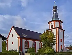 Die Saalkirche wurde 1632/33 unter Verwendung eines romanischen Chorturms als Chorflankenturm an der Ostseite des eingezogenen, halbrund abgeschlossenen Chors im Norden des Langhauses erbaut. In der Nordostecke befindet sich die Sakristei unter einem nach Norden abfallenden Pultdach. Die Kirche wurde nach einem Brand 1636 im 18. Jahrhundert wiederaufgebaut. Der Kirchturm erhielt ein achteckiges Obergeschoss, das die Turmuhr und den Glockenstuhl mit drei Kirchenglocken beherbergt.[1] Bedeckt wurde der Kirchturm mit einem geschwungenen Helm, der in eine offene Laterne übergeht, die von einer Zwiebelhaube bekrönt wird. Das mit einem Tonnengewölbe überspannte Erdgeschoss des Kirchturms wird als Kapelle verwendet, in deren Innenraum sich an der Nordseite ein Sakramentshaus befindet. Das Langhaus ist mit einem Satteldach bedeckt, sein Innenraum ist mit einer Flachdecke überspannt, ebenso wie der des Chors.