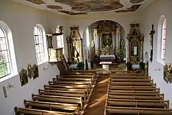 Die Deckenmalerei mit Szenen aus dem Leben der heiligen Walburga stammt von Johann Michael Franz. Zur Kirchenausstattung gehört ein Hochaltar aus dem ersten Viertel des 18. Jahrhunderts, der von je vier Säulen flankiert wird. Daneben stehen Statuen des heiligen Petrus und des heiligen Paulus. Auf dem Altarretabel ist die heilige Walburga zu sehen, auf dem Altarauszug eine Darstellung der Trinität.