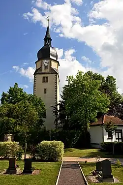 Die Grundsteinlegung des gotischen Turms erfolgte am 28. April 1396, worauf eine steinerne Inschrift an der Kirchenwand weist. Dicke Mauern an der Westwand der Kirche deuten auf einen Vorgängerturm hin. Ab dem dritten Obergeschoss aufwärts hat der Turm einen achteckigen Grundriss. Der Turm wurde ursprünglich durch einen Zinnenkranz mit etwa 2 m hohen Zinnen bekrönt. Andere Attribute des Turms, wie die sieben Schartenkammern bezeugen die einstige Wehrhaftigkeit der Kirche. Die Kirche war keine Wehrkirche, sondern wurde nur mit wehrtechnischen Elementen ausgestattet, wie z. B. die Schießnischen. Sie waren mannshoch und rund 150 cm breit, damit der Schütze, damals noch mit einer Armbrust ausgestattet, genügend Bewegungsfreiheit für sich und seine Waffe hatte. Aus der gotischen Bauzeit sind auch die einfachen Spitzbogen-Fenster an den drei Chorseiten erhalten. Konrad Stolle, Erfurter Chronist (1436–1501), teilte in seinem Memoriale mit, dass der Turm am 26. August 1450 belagert wurde. Man erreichte den Eingang zum ersten Geschoss nur über eine Leiter. 1715 wurde dem Turm das wehrhafte Äußere genommen. Der Turm hat im Erd- und den beiden ersten Obergeschossen einfache, im dritten Obergeschoss gepaarte Rechteckfenster, in dem darauf folgenden Achteck-Geschoss von 1715 wieder einfache Fenster. Es folgt eine Schweifkuppel mit offener Laterne und darauf ein ziemlich hoher Helm.