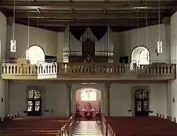 Das Kegelladen-Instrument ist auf einer Empore aufgestellt und verfügt über 19 Register, verteilt auf zwei Manuale und ein Pedal. Die Spieltraktur ist elektropneumatisch, die Registertraktur ist elektrisch. Die Stimmtonhöhe beträgt 440 Hz. Die Temperatur ist gleichstufig. Die Disposition lautet wie folgt:[3]