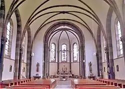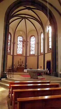 Im Jahr 1882 wurde der Grundstein des Kirchbaus St. Wendalinus mitten im Dorf und 40 Meter über dem Rosseltal gelegt. Die Kirche ist eine einschiffige Hallenkirche mit Orgelempore und leicht höher liegendem Chor. Überspannt ist der Raum von einem Rippengewölbe. Der Baustil ist dem romanischen Stil nachempfunden, der konsequent von den Fensterbögen über die Chor- und die Deckenbögen bis hin zu den Schallluken am Glockenturm durchgehalten wurde. An den beiden Seiten des Chorbogens ist jeweils ein Seitenaltar aufgestellt. Heute findet sich vom Gottesdienstbesucher aus gesehen auf der rechten Seite der Marienaltar, darüber eine schlichte Marienfigur aus Holz, und auf der linken Seite ein Josefsaltar, darüber ebenfalls eine schlichte Figur aus Holz, die Josef darstellt.