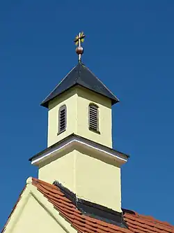 Das kleine Kirchengebäude ist ein flachgedeckter Bau, dessen Apsis halbrund geschlossen ist. An beiden Längsseiten befindet sich jeweils ein rechteckiges Fenster, der Zugang zur Kapelle erfolgt durch eine rechteckige Tür an der Westseite. Außen sind ein flach vorkragendes Traufgesims und profilierte Giebelschrägen. Über dem Westgiebel befindet sich ein quadratischer Dachreiter mit Gesims. Im Oberteil des Dachreiters sind kleine Rundbogenöffnungen vorhanden. Gedeckt ist der Dachreiter mit einem Zeltdach.