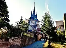 Die Kirche ist ein Putzbau mit schiefergedecktem Dächern, die Strebepfeiler und die Fenstergewände sind aus Sandstein. Auch am Langhaus sind Strebepfeiler vorhanden; demnach war von Anfang an vorgesehen, den Bau einzuwölben. Die dreiteiligen Fenster zeigen reiches spätgotisches Maßwerk aus Kielbogen- und Fischblasenmotiven. Das östliche Fenster auf der Nordseite des Langhauses zeigt zur Erinnerung an den Bürgermeister Johannes Carl Bersch († 1614) dessen Initialen im Maßwerk. Ein Kaffgesims, das den Bau umläuft, bildet auch die Sohlbänke der Fenster. Der Chor mit Fünfachtelschluss ähnelt in der Ausführung der Fenster, Strebepfeiler und Gesimse dem Langhaus. Die Portale der Nordseite stammen aus der Spätgotik, die Portale der Südseite wurden wie auch das Westportal 1890 geschaffen.