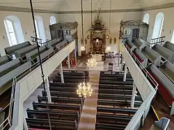 Im Inneren überwölbt ein hölzernes Tonnendach den Saal. Die dreiseitig umlaufende Empore ist im Westen doppelgeschossig, auf der oberen befindet sich die Hauptorgel. Die südliche Prieche im Chor hat eine aufwändige Brüstung.