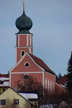 Die Saalkirche wurde 1726 im Auftrag von Maria Anna Katharina Gräfin von Montfort nach einem Entwurf von Johann Rigalia dem Jüngeren errichtet. Sie besteht aus einem Langhaus, das mit einem Satteldach bedeckt ist, einem eingezogenen Chor mit leicht geschwungenem Abschluss im Osten und einem Chorflankenturm an dessen Nordwand, dem 1746 ein Geschoss mit abgeschrägten Ecken aufgesetzt wurde, das die Turmuhr beherbergt, auf dem eine Zwiebelhaube sitzt. Im Geschoss darunter befindet sich der Glockenstuhl, in dem vier Kirchenglocken hängen.[1]