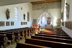 Der Innenraum des Langhauses ist mit einer 1930 eingebauten Holzbalkendecke überspannt, der des Chors mit einem Kreuzrippengewölbe. Die Kirchenausstattung wurde 1960/61 durch Otto Kobel erneuert, zum Beispiel die Kreuzigungsgruppe über dem Altar im Chor. Die Statuen der Maria von etwa 1420 (die älteste Figur der Kirche), die ursprünglich in der Kapelle von Großmederschach stand, und der Anna Selbdritt von 1500/10 blieben erhalten.