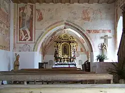An der Ostwand, teilweise vom Hochaltar verdeckt, ist links die Heimsuchung Mariens zu sehen, deren Farben nahezu vollständig verblasst sind. Das Motiv ist heute nur noch anhand der Rötelzeichnung erkennbar. In der Mitte über dem kleinen Fenster ist ein rauchfassschwingender Engel dargestellt; die Fensterlaibung ist mit Rankwerk ausgefüllt. Rechts sind Maria und Josef auf der Wanderung dargestellt. Auch in der Chorbogenlaibung wurde bei der Freilegung der Fresken um 1900 Rankwerk festgestellt; in die noch erkennbaren Medaillons waren zuvor neugotische Heiligenbilder gemalt worden.[2][4][6]
