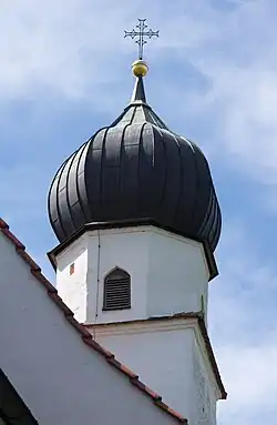 Den westlichen Abschluss bildet der ausgeschiedene Turm über rechteckigem Grundriss. Der bis knapp über Firsthöhe reichende spätgotische Unterbau umfasst vier Geschosse, wobei das zweite und dritte mit teilweise gefasten Spitzbogenblenden verziert ist. Der 1689 aufgesetzte achteckige Aufsatz enthält den Glockenstuhl und weist nach vier Seiten hin spitzbogig veränderte Schallöffnungen auf. Auf der Südseite ist im Mauerwerk des Oberbaus ein Ziegel mit der Jahreszahl der Erbauung (1689) zu finden. Nach oben hin schließt der Turm mit einer kupferbedeckten Zwiebelhaube mit Kugel und Kreuz ab.[3][4]