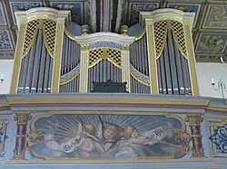 Die heutige Orgel in St. Wolfgang verfügt über 18 Register auf zwei Manualen und Pedal und ist ein Werk von Johann Christian Kayser aus dem Jahr 1797.[1] 1855 wurde das Instrument von Karl Traugott Stöckel repariert, 1857 wurden die Bälge von Karl August Schröder untersucht. Nachdem im Jahr 1861 kleinere Reparaturen durch einen ortsansässigen Tischler durchgeführt worden waren, führten die Gebrüder Jehmlich 1862 eine größere Reparatur durch und bauten dabei vermutlich die Register Aeoline 8′ und Schwiegel 8′ ein. 1872 erneuerte Karl Traugott Stöckel Teile der Traktur und baute Kastenbälge ein. 1917 wurden die Prospektpfeifen abgegeben (später durch Pfeifen aus Zink ersetzt) und ein elektrisches Schleudergebläse eingebaut. Im Jahr 1960 wurden durch Jehmlich Reinigungen und Imprägnierungen durchgeführt, das Pfeifenwerk überholt und Holzteile mit Anobienbefall ersetzt. Dabei wurde Sifflet 1′ anstelle der Aeoline 8′ eingesetzt und das zusätzliche Register Schwiegel 8′ aus dem Oberwerk wieder entfernt.[2] Die Disposition lautet:[1]