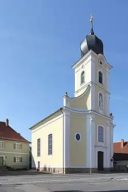 Die nach Südosten gerichtete, barocke Saalbaukirche steht in der Ortsmitte und hat eine aus der Flucht der Dorfstraße hervortretende Einturmfassade.