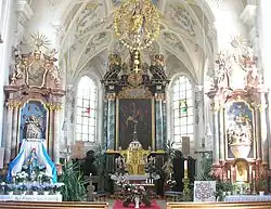 - Die Seitenaltäre sind Arbeiten von Andreas Bergmüller aus dem Jahr 1725 und bestehen ebenfalls aus marmoriertem Holz. Je zwei Säulenpaare flankieren Nischen mit geschnitzten Figurengruppen. Rechts erkennt man die Heilige Sippe aus der Werkstatt von Lorenz Luidl, die Muttergottes des linken Seitenaltares ist modernen Ursprungs. In den geschweiften Bildfeldern der Auszüge sind die heilige Barbara und die heilige Katharina (rechts) bzw. die heilige Margareta und der heilige Vitus dargestellt.