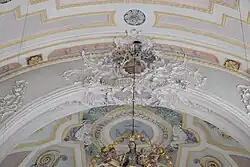 Die Stuckaturen entstanden in zwei Abschnitten. Um 1685 schuf Johann Schmuzer ein hochbarockes Dekor nach Wessobrunner Art. Die Decken sind in geometrische Felder unterteilt. Engelsköpfe mit Flügeln, Laubwerk, Fruchtbündel, Rosetten, Ranken und Füllhörner treten plastisch hervor.