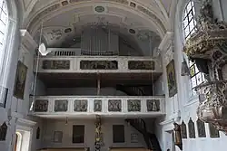- In die Brüstungen der Westempore sind Ölbilder aus dem späten 17. Jahrhundert eingelassen. Die Bilder der oberen Empore stellen die vier Kirchenväter dar, die Bilder der unteren Empore die Apostel mit Christus.