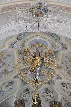 - Das bedeutendste Ausstattungsstück ist die große Rosenkranzmadonna über dem Choreingang. Die Gottesmutter wird von jubilierenden Engeln umgeben. Die Gruppe ist eine Stiftung des Pflegamtsverwalters Jakob Micheler, dessen Wappen unter der Hauptfigur angebracht wurde.