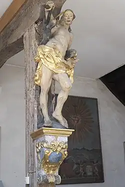 - Im Chor stehen links und rechts des Hochaltares zwei Vortragekreuze aus der ersten Hälfte des 18. Jahrhunderts. Am Chorbogen trägt eine Konsole eine kleine Figur des heiligen Sebastian. Eine größere Darstellung des Heiligen ist unter der Westempore zu sehen. Auch diese Bildwerke entstanden im 18. Jahrhundert. Aus dieser Zeit stammen auch die Pietà im Oratorium und die Kreuzigungsgruppe im Langhaus. Die Assistenzfiguren der Kreuzigung werden Lorenz Luidl zugeschrieben.