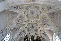 Die Rokokoelemente fügte Jakob Jehle um 1755 hinzu. In den Rocaillekartuschen über dem Chorbogen finden sich die Inschriften: PAULUS RESTAURAVIT MDCLXXXV (Paul restaurierte die Kirche 1685) – LUDOVICUS RENOVAVIT MDCCLV (Ludwig renovierte die Kirche 1755). In der Mitte ist das Wappen Raimund Fuggers zu sehen. Die zugehörige Inschrift lautet: MD RAIMUNDUS AEDIFICAVIT XXVIII (Raimund erbaute die Kirche 1528).