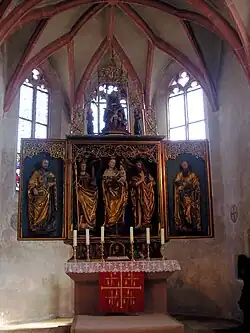 Das spätgotische Bauwerk in Quadermauerwerk aus Sandstein wurde in den Jahren 1489–1491 durch Hermann Winkler und Michael Pernolt auf dem durch Mauer und Graben befestigten Burgstall errichtet. Die spätgotische Saalkirche besteht aus dem Langhaus mit korbbogigem, hölzernen Tonnengewölbe und einem eingezogenen Chor mit Fünfachtelschluss mit Netzgewölbe und Maßwerkfenstern. Die umlaufenden Emporen im Langhaus wurden um 1700 eingebaut. Das schlichte Äußere wird durch einen Dachreiter mit Haube und Uhr auf dem Langhausdach akzentuiert.