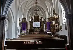 1679 wurde die ursprünglich gotische Kirchenausstattung durch eine barocke Ausstattung ersetzt. Hervorzuheben sind dabei der hl. Wolfgang, der von den heiligen Rittern Sigismund und Georg auf dem Hochaltar flankiert wird, der Kreuzigungsaltar beim Nordeingang und vor allem einer Holzskulptur einer Anna selbdritt auf dem rechten Seitenaltar.