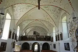 Der Innenraum ist mit einem Kreuzrippengewölbe überspannt, dessen Gewölberippen im Zuge der Barockisierung 1720 abgeschlagen wurden. Der Hochaltar aus der zweiten Hälfte des 17. Jahrhunderts wird von den Skulpturen des Rupert von Salzburg und des Erasmus von Antiochia flankiert. Auf dem Altarretabel ist Wolfgang von Regensburg dargestellt. Auf der Brüstung der Empore sind vier Bilder in Ölmalerei angebracht, auf denen seine Vita beschrieben wird.