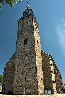 Im Südwesten des Kirchengebäudes steht der 72 Meter hohe Kirchturm. Er verfügt über eine Türmerwohnung, einen Glockenstuhl mit drei Bronzeglocken und einem umlaufenden Aussichtsgeschoss darüber. Die Türmerstube war eine komplette Wohnung für eine Familie, die für das regelmäßige Läuten der Glocken und die Kontrolle auf Stadtbrände zuständig war. Sie wurde bis 1945 bewohnt.