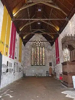 Strebepfeiler gliedern die Seitenfassaden der länglichen Saalkirche in vier Achsen. Das Gebäude ruht auf einem Sockel mit Gesims. Es sind spitzbogige Maßwerke mit Bleiglasfenstern eingelassen. In den Ostgiebel ist ein hohes Maßwerk aus fünf Lanzettfenstern eingelassen. Fragmente der Eichenkanzel stammen aus dem 16. Jahrhundert. Sie wurde jedoch im 19. Jahrhundert stark überarbeitet. In spitzbogigen Aussparungen an der Südostseite sind drei Sedilien installiert.[1]