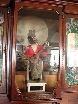Besonderer Blickfang im Speiseraum der Gaststätte ist ein Musikschrank der Leipziger Firma E. Dienst & Co, ein sogenanntes Orchestrion. Es handelte sich um eine Art überdimensionale Spieluhr, die, durch ein Gewicht mechanisch angetrieben, mit den Mitteln der damaligen Zeit die Musik eines ganzen Orchesters (welches, anders als der Name es suggeriert, nicht nur aus Mandolinen besteht) darbieten sollte. Das Musikwerk wird über eine Holzwalze mit kleinen Stahlstiften betrieben. Das Gewicht an der Rückwand und eine Fliehkraftregelung sorgen für eine gleichmäßige Geschwindigkeit beim Abspielen der Musik. Auf der Walze sind 7 verschiedene Lieder. Wenn man diese um 1 bis 1,5 mm verschiebt, erklingt jeweils eine andere Melodie. In der Mitte steht ein mandolinespielender Affe, der schließlich zum Namensgeber des Lokals wurde. Der Affe wird über eine kleine Walze unter dem Stuhl bewegt, die wiederum von der großen Walze gesteuert ist. Mit der Kurbel kann man an der linken Seite das Gewicht nach oben drehen, bis der Gong ertönt. Leider ist bis heute nicht sicher, wann das Gerät (D.R.G.M. Mandolinen Orchestrion „Ideal“) hergestellt wurde. Man schätzt seine Entstehung zwischen 1903 und 1905. Es ist im Jugendstil gestaltet und gelangte schließlich in den Besitz der Zwickauer Vereinsbrauerei, die es einstweilen einem Gasthaus in Mülsen St. Jacob zur Verfügung stellte, doch konnte der dortige Wirt seine monatlich fälligen Abzahlungsraten nicht mehr tätigen. Daher wurde der Musikschrank auf Betreiben des Brauereidirektors in das von ihm vorfinanzierte Lokal in Steinheidel verfrachtet, um ihm einen guten Start zu ermöglichen. Hier erfreut das Orchestrion seit mehr als 100 Jahren die Gäste im Saal.