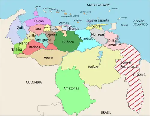 Venezuela ist in 23 Bundesstaaten (estados) sowie den Hauptstadtdistrikt Distrito Capital unterteilt. Des Weiteren gibt es noch die so genannten Dependencias Federales de Ultramar, welche aus einer Reihe von Venezuela abhängiger Inseln bestehen.