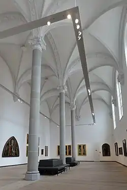 Das prunkvolle Deckengewölbe der Katharinenkirche, das durch ein Renaissancegemälde von 1517 einen weiteren Blickfänger bietet, entstand nahezu zur gleichen Zeit wie die ausgestellten Kunstwerke und bildet damit einen eigenen Beitrag zum Gesamteindruck. Die Raumaufteilung des frühen 19. Jahrhunderts entspricht den ehemaligen Funktionsbereichen Nonnenempore, Laienkirche und Chor. Der Raumeindruck der ehemaligen Klosterkirche wird jedoch durch die Zwischenwände und das heutige Fußbodenniveau verfälscht. Beim Umbau zur Galerie wurde eine Zwischendecke eingezogen, die knapp über der ehemaligen Nonnenempore liegt.