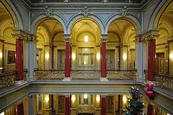 Das Gebäudeinnere lagert sich um einen überdachten Lichthof der zweigeschossig von einem Säulenumgang umgeben ist und über eine Festtreppe verfügt. Im Obergeschoss befindet sich straßenseitig ein prächtiger Festsaal. Darüber hinaus bestehen luxuriöse Wohnräume, die mit aufwändigen Ausmalungen versehen sind. In der Suite des Kaisers befindet sich ein allegorisches Deckengemälde.