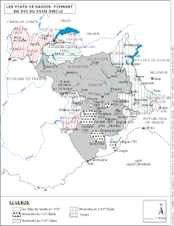 Das Herzogtum der Savoyer war ein heterogenes Gebilde, das beiderseits der Westalpen im Wesentlichen Savoyen, Piemont und die Grafschaft Nizza umfasste. Haupt- und Residenzstadt war zunächst Chambéry, ab 1563 dann Turin. Aus dem französischsprachigen Westen stammte der einflussreichere alte Adel, in den italienischsprachigen Ebenen im Osten konzentrierte sich die Wirtschaftskraft des Herzogtums. Die Teilung in zwei unterschiedliche Sprach- und Landschaftsräume brachte insbesondere für die Regierungsarbeit Schwierigkeiten mit sich, da man prinzipiell zusammengehörende Behörden oft teilen musste. Eine andere Lösung stellte die für die damalige Zeit in Europa nicht unübliche Herrschaftsausübung durch Reisen dar. Charakteristisch für das Herrschaftsgebiet der Savoyer und deren Regierungsgeschäfte blieb bis 1861 die sprachliche Uneinheitlichkeit und die Rivalität zwischen Savoyen und Piemont. Ausgleichend wirkte meist der Adel aus dem Aostatal.