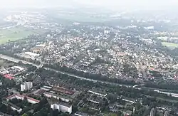 | Burgdamm: links die Stader Landstraße mit der Brücke über die Autobahn, im Vordergrund die Wohnsiedlung Marßeler Feld mit dem Wohnhochhaus an der Ecke Stockholmer Straße | |