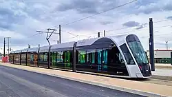 Alle Haltestellen liegen oberirdisch auf Straßenniveau und verfügen über Bahnsteige mit einer einheitlichen Länge von 60 m und einer Höhe von 30 cm,[21] sodass auf der gesamten Länge des Zuges ein barrierefreier Einstieg möglich ist.