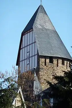 Bitzenturm: Nach innen offener fünfgeschossiger Halbschalenturm mit flachbogigen Nischen und spitzbogigen Schlitzen. Rechteckige Fenster, wobei die Geschosseinteilung durch einfache, mit Bohlen abgedeckten Holzbalken erfolgte. Balkenlöcher und Auflager sind noch deutlich erkennbar. Holzleitern führten zu den einzelnen Stockwerken.
