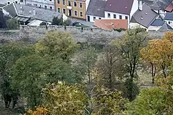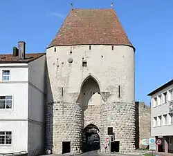Nach Süden zum Burgberg hin gibt es eine etwas niedrigere spätromanische in Ost-West-Richtung verlaufende Wehrmauer teils mit originalen Zinnen. Ebendort befindet sich am Ende der Freyungsstraße ein Torbau um 1853 der Marc-Aurel-Kaserne, wohl an der Stelle des mittelalterlichen Verbindungstores zur Burg.