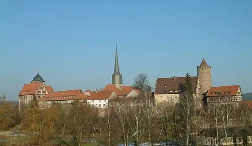 | Feuchtwangen | Burg Feuchtwangen | besitzt noch in den Stadtmauerresten die anschauliche Einbindung des sogenannten Öttingischen Schlösschens (ehemalige Wasserburg) als Auskragung in der ansonsten runden Stadtmauer, später wurde im Areal das Jagstheimische Schlösschen erbaut[4] |