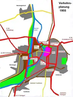 Ein Ziel der neuen Verkehrsplanung war, die Innenstadt vom Durchgangsverkehr zu befreien, der in der Vorkriegszeit noch durch Fleiner- und Sülmerstraße als Nord-Süd-Achse, bzw. durch die Kaiserstraße als West-Ost-Achse führte. Einen ersten Verkehrsplan erstellten Karl Gonser und Kurt Leibbrand, die eine die Kernstadt umschließende Ringstraße vorsahen.[50] Die Gonser’sche Verkehrsplanung wollte die Allee als Ringstraße ausbilden und den Böckinger Rangierbahnhof an den Ostrand des Industriegebiets entlang der Neckarsulmer Straße verlegen. Für die Verlegung der Rangieranlagen und die Umgestaltung des Hauptbahnhofs standen jedoch keine Mittel zur Verfügung, so dass der „Gonser’sche Ring“ scheiterte.[51] Später schlugen die Hochschullehrer Wilhelm Tiedje, Hannes Mayer und Carl Pirath eine „rechteckige mit je zwei Parallelstraßen in Nord-Süd- und Ost-West-Richtung“ verlaufende Verkehrsführung vor.[50] Beutinger wollte verhindern, dass der Neckar für eine neue Nord-Süd-Verbindung zugeschüttet wurde, wobei „zu den kühnsten Ideen […] einmal eine Straße auf Stelzen über dem Fluss entlang seines Verlaufs gehört“ hatte.[52] Zugeschüttet wurde nur der nördliche Seitenarm des Neckars, um darauf die Mannheimer Straße, eine der beiden vorgesehenen West-Ost-Verbindungen als Verlängerung der Weinsberger Straße nach Westen und über die Weipertstraße zur Bleichinselbrücke zu bauen.[51] Die westliche Tangente, die die Ringstraße schließen sollte, wurde nie verwirklicht.[52]