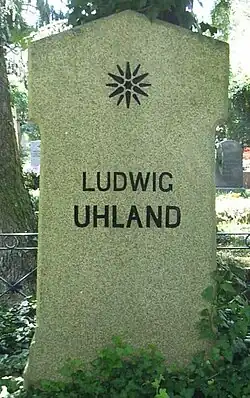 - Ludwig Uhland (* 1787 Tübingen; † 1862 Tübingen), Dichter, Literaturwissenschaftler, Jurist und Politiker. Neben Uhland liegt seine Frau Emilie begraben. Ihrem Wunsch gemäß soll das Grab lediglich von Efeu und Immergrün bewachsen sein. Uhlands Grabstein ist so schlicht ausgefallen und nach Osten ausgerichtet, weil der Dichter schon im März 1812 verfügt hatte:[9]
