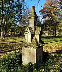 Die ursprüngliche Form der Anlage ist in einem Plan von P. J. von de Fenn aus dem Jahre 1833 überliefert. Der Plan zeigt einen quadratischen Begräbnisplatz, der mit einem strengen Achsenkreuz in vier gleich große Grabfelder eingeteilt war. Allein die klassizistische Grabkapelle und das große Eingangstor heben die Mittelachse hervor. Der Plan zeigt aufwendige Torflügel zwischen unverputzten Pfosten mit pyramidaler Abdeckung. Unter Beibehaltung des strengen Wegenetzes wurde der Friedhof mehrfach erweitert bis zu seiner Auflassung 1867. Einzelne Denkmäler und Grabsteine wurden in den Park integriert und sind noch heute erhalten.