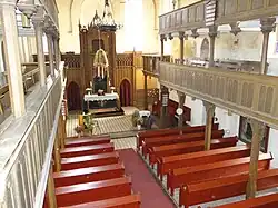 1872 wurden die heute noch vorhandenen und als Besonderheit in mecklenburgischen Kirchen geltenden, zweigeschossig umlaufenden Emporen an der Süd-, West- und Nordwand sowie eine eingeschossige Empore hinter dem Altar eingebaut. Damit vermehrte sich die Zahl der Sitzplätze auf 550.[22] Auch die Ostempore war einst eine doppelgeschossige Anlage, wurde aber wie der verglaste Aufbau der Herrschaftsempore (Amtsstuhl) 1955 auf der Südseite entfernt.[23] Den ältesten Emporen kann man die Brüstungen im zweiten Geschoss der Westempore und die Schornsteinummantelung in der Nordwestecke sowie die Brüstungen der Ostempore zuordnen. Die Herrschaftsempore entstand vermutlich im 18. Jahrhundert. Dagegen wurden die zweigeschossigen Emporen der Nord- und Südseite sowie die untere Empore der Westseite mit der großen Renovierung nach 1842 eingebaut und erhielten ihr heutiges Aussehen mit den Holzimitationsmalereien.