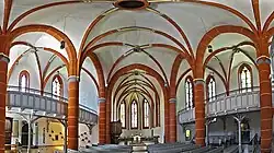 Wie bei mittelalterlichen Kirchenbauten häufig zu beobachten, wurde zuerst der Chor im Osten erstellt. Er konnte nach Abschluss der Dacharbeiten und anschließenden Einwölbung benutzt werden, während die Baumaßnahmen am Langhaus weitergingen. Nach einigen Verzögerungen wurden die Dächer über den Seitenschiffen errichtet. Im Zusammenhang mit der Fertigstellung des Baus wurde ein Altar im südlichen Seitenschiff aufgestellt, er war der heiligen Katharina geweiht. Der älteste Altar war der Schutzpatronin Maria gewidmet, ein zweiter den Aposteln Petrus und Paulus. Am 1. Juli 1500 kam ein Heiligkreuzaltar hinzu.