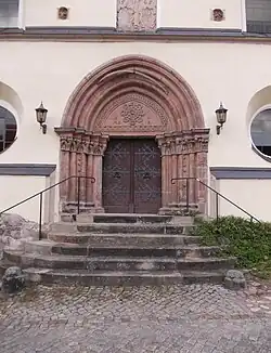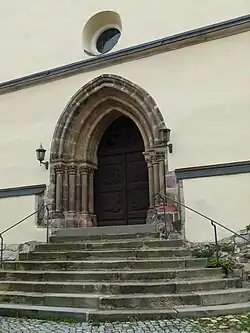 Das spätromanische Westportal, zu dem neun Stufen hinaufführen, ist in Sandstein und violettem Porphyr ausgeführt und stammt aus der Zeit um 1220/1230. Es bildete ehemals den Eingang vom Kreuzgang zum Kapitelsaal. Die Gewände dieses Stufenportals sind mit je vier Säulen mit Blattkapitellen und Kämpfern versehen, darüber sind spitzbogige Archivolten ohne Tympanon angeordnet. Am östlichen Teil der Südfassade ist ein einfacheres, spätgotisches Sandsteinportal eingebaut. Über dem Kaffgesims sind acht spätromanische Figurenkonsolen eingemauert, welche gleichfalls aus Altzella, vermutlich aus der Allerheiligenkapelle, stammen, wo sie als Gewölbeanfänger dienten.