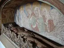 Das Heilige Grab in einer Nische an der Nordwand stammt aus der Zeit der späten Gotik. Der überlebensgroße Leichnam wurde gemäß einer Inschrift 1464 geschaffen und ist als Halbreliefplastik auf einem Sarkophag ruhend dargestellt, während die üblichen Assistenzfiguren als Fresken an die Rückwand der Nische und an der Kirchenwand über der Nischenbekrönung aufgemalt sind. Die Nische wird von Blendmaßwerk bekrönt, ebensolches verziert auch am unteren Abschluss den Sarkophag.