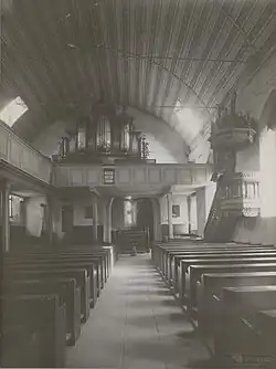 Über einen verhältnismäßig niedrigen gotischen Chorbogen öffnet sich der Chor hin zum Kirchenschiff, das etwa 12,5 × 25,6 Meter misst. Das Kirchenschiff wurde ausgehend von dem ersten Chorturmkirchenbau wohl zu Beginn des 17. Jahrhunderts nach Norden und Westen erweitert und ist daher nicht symmetrisch zum Chor. Es wird von einem historischen hölzernen, mit Blumenranken bemalten Tonnengewölbe überspannt. Auffallend sind die unterschiedlich großen Fenster in der südlichen Seitenwand. Generell sind die großen Seitenfenster der Kirche jüngeren Datums, die beiden zusätzlichen kleinen Fenster in der Südfassade sind älter, waren aber zeitweise vermauert und wurden erst 1964 wieder geöffnet.
