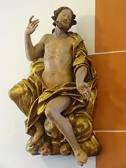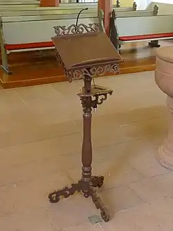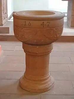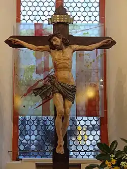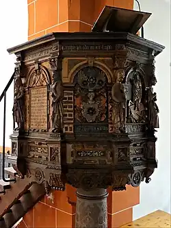 In der westlichen Wand des Chors ist eine rechteckige Nische eingelassen, die mit einer eisernen Tür verschlossen wird. Das fast lebensgroße Kruzifix des Dreinageltypus hinter dem Sandstein-Altar im Chor stammt aus dem Anfang des 17. Jahrhunderts.[16] Der Kreuzestitel INRI erscheint auf Hebräisch, Griechisch und Lateinisch. Die Mensaplatte wurde 1985 erneuert, als der Altar etwas nach vorne versetzt wurde. Die mit Beschlagwerk reich verzierte Kanzel eines unbekannten Holzschnitzers wurde 1616 von Amtmann Arnold Schwartz und seiner Frau Margreta von Haubitz gestiftet. Sie ruht auf einer bauchigen, steinernen Rundsäule mit einer sechsseitigen Basis. Die Kanzelfelder werden in den Ecken durch Figuren des Paulus und der vier Evangelisten mit ihren Symbolen gegliedert.[10] Die Felder zeigen die beiden Wappen der Stifter, den auferstandenen Christus und eine Schrifttafel. Der Schalldeckel trägt eine Inschrift mit dem Bibelwort aus Jes 49,23 .[22] Das pokalförmige Taufbecken aus Sandstein mit vier Reliefs aus geflügelten Engelköpfen ist mit der Jahreszahl 1647 bezeichnet. Es ruht auf einer Rundsäule, deren Basis aus zwei konvexen Wulsten und dazwischen zwei Hohlkehlen gebildet wird. Das hölzerne Lesepult von 1738 stammt aus Burgbracht[23] und wurde der Gemeinde 1962 von der Landeskirche überlassen. Links am Triumphbogen ist eine holzgeschnitzte barocke Figur zu sehen, die Christus bei seiner Himmelfahrt darstellt und 1928 gestiftet wurde.[24]
