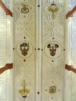 Der Innenraum wird von einer stuckierten Flachdecke mit drei Längsunterzügen abgeschlossen, die auf Holzpfeilern ruhen, die eine dreiseitig umlaufende Empore einbeziehen. Die Emporenbrüstungen haben kassettierte Füllungen. Die Emporenstützen sind achtseitig, während die Decke von vier Rundsäulen aus Eiche getragen wird. Die weiße Stuckdecke zeigt reiche geometrische Verzierungen und Medaillons. Sie wird in den mittleren beiden Stuckfeldern mit den polychromen Wappen des Landgrafen Ludwig V. und seiner Frau Magdalena von Brandenburg verziert.[19] Sie werden von Schriftfriesen umrahmt: „SACRA DEO DOMVS HAEC LVDOVICO PRINCIPE FACTA EST HANC VT ET HVNC DEXTRA PROTEGE CHRISTE TVA“ (Dieses Gott geweihte Haus ist unter dem Landgrafen Ludwig erbaut worden. Christus schütze es und ihn mit deiner Rechten) und „MAGDALIS ILLVSTRIS LVDOVICI PRINCIPIS VXOR BRANDENBVRGIACO STEMMATE NATA FVIT“ (Magdalena, des erlauchten Landgrafen Ludwig Gemahlin, ist geboren aus brandenburgischem Geschlecht).[20] Die benachbarten Vierpässe zeigen zweimal kreuzweise einen vergoldeten Doppeladler mit einer silbernen Krone als Symbol des Reiches und als Symbol für die sich aufopfernde Liebe Christi einen Pelikan mit seinen Jungen, um dessen Füße sich eine Schlange windet. Die Jahreszahl in der Inschrift „1616 MORTVOS VIVIFICO“ (Die Toten mache ich lebendig).[10] weist offensichtlich auf das Todesjahr der Landgräfin.[21] Unterhalb der Empore sind ebenfalls Stuckarbeiten angebracht. Dieselbe Arbeitsweise wie in den Kirchen zu Niederweisel und Wohnbach lässt dieselbe Werkstatt vermuten.[20]