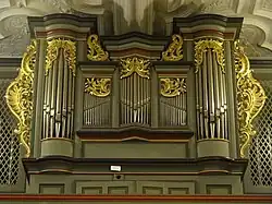 1935 baute die Licher Firma Förster & Nicolaus hinter dem alten Prospekt ein neues Orgelwerk mit 22 Registern und zwei Manualen. Im Zuge der Umsetzung auf die Nordempore baute dieselbe Firma 1960 ein neues Innenwerk mit 18 Registern unter Einbeziehung alter Pfeifen.[26] 1961 fand die Einweihung statt.