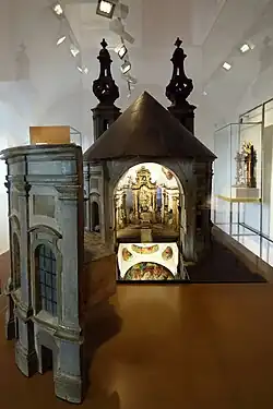 Das 1. Obergeschoss des Stadtmuseums ist der Kunst in Burghausen vom Mittelalter bis in die Gegenwart gewidmet. Architektonisch besondere Räume wie beispielsweise ein gotisches Kreuzrippengewölbe bieten hierfür die passende Kulisse.[22] Als Residenzstadt und später als Regierungsstadt beherbergte Burghausen zahlungskräftige Auftraggeber: Landesherr, Klerus, Adel und Bürgertum ließen Bauwerke errichten, Kirchen ausstatten und Porträts von sich malen. Für diese Aufträge gab es seit dem Mittelalter eine Vielzahl an Handwerkern wie Baumeister und Steinmetze sowie ab dem Ende des 16. Jahrhunderts stets zwei Malerwerkstätten und eine Bildhauerwerkstatt. Die wohl bedeutendsten Künstler in Burghausen zur Zeit des Barock waren der Maler Johann Nepomuk della Croce (1736–1819) und der Bildhauer Johann Georg Lindt (um 1733–1795).[25] Ihre Kunstwerke und die der zahlreichen anderen Burghauser Künstler können in dieser Abteilung entdeckt werden. Herausragend ist das Baumodell der 1760/64 neu errichteten Wallfahrtskirche Marienberg bei Burghausen. Es handelt sich um das einzige erhaltene süddeutsche Baumodell des 18. Jahrhunderts, das die architektonische Gliederung, die komplette Innenausstattung und die Farbigkeit des Außenbaus und des Innenraumes zeigt.[26] Auch das detailreiche Modell des Marienberger Hochaltares mit 32 Engeln ist in der Ausstellung zu sehen. Am Neubau dieser Kirche waren nicht nur bekannte Burghauser Künstler, sondern auch der bedeutende Rokoko-Freskant Martin Heigl beteiligt.[27]