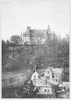In den Jahren 1890 bis 1892 wurde die schlossähnliche Villa Pflugensberg im Auftrag des Großindustriellen Friedrich Eduard von Eichel-Streiber erbaut.[6] Zur Villa entstanden nach 1900 weitere Funktions- und Wirtschaftsgebäude: das als „Rentamt“ bezeichnete Verwaltungsgebäude in der Bornstraße, heute Johann-Sebastian-Bach-Straße, lag am südlichen Zugang zum Grundstück. Dahinter folgten eine Gärtnerei mit Gewächshäusern und Mistbeeten sowie der Reitstall, am Platz des ehemaligen Pflug'schen Gartenhauses. Im östlichen Teil des Grundstücks befand sich der Rosengarten und ein Tennisplatz. Die Hauptzufahrt zum Grundstück erfolgte über die heutige Dr.-Moritz-Mitzenheim-Straße. Dort befand sich ein weiteres Wohngebäude für die Hausverwaltung. Gleichzeitig wurde der Eichelsche Park von dem königlich-sächsischen Gartendirektor Max Bertram neu gestaltet. Neben den bereits vorhandenen Großbäumen schuf Bertram eine Kombination aus Teppichbeeten sowie ein Bewässerungssystem mit Verbindung zum nahen Hochbehälter des Eisenacher Wasserwerkes. Über seine Eisenacher Projekte berichtet Bertram auch ausführlich in seinem Lehrbuch zur Gartenkunst.[8] Das Grundstück war entsprechend der städtischen Satzungen vollständig eingezäunt und entlang der heutigen Wartburgallee (damals wurde diese gerade als Karthäuserstraße projektiert) durch eine mannshohe Klinkersteinmauer abgegrenzt. 1903 wurde am Eingang des Stadtparks ein Denkmal zu Ehren von Otto von Bismarck geweiht.[9]